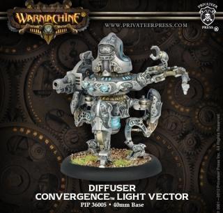 Le Diffuser est une merveille mécanique équipée d’un lance-piques et d’un relais arcanique sophistiqué. Chaque pique a des ailettes qui sont contrôlées par un mécanisme d’horlogerie. Cela permet au relais arcanique d’ajuster la trajectoire de chaque pique et de maximiser la probabilité de toucher de chaque tir. Le relais envoie un signal similaire aux autres Vectors, Clockwork Vessels et prêtre de Cyriss afin qu’ils dirigent leurs efforts vers l’éradication des cibles marquées.