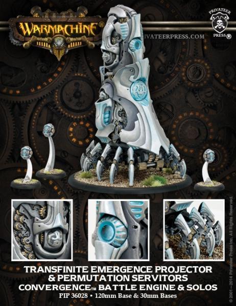Le Transfinite Emergence Projector & Permutation Servitors est vendu en boîte (PIP 36028). Un joueur peut recruter jusqu’à deux Transfinite Emergence Projectors par warcaster dans une armée de la Convergence.