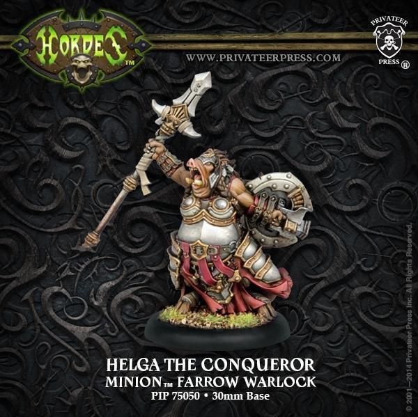 Ayant sécurisé de vastes territoires par une combinaison de force et d’astuce, Helga the Conqueror est une des plus formidables maîtres de guerre Farrow. Avec sa grande lance et son canon de bouclier, elle est un véritable ouragan d’acier sur le champ de bataille et elle utilise son énergie mystique pour renforcer les guerriers qui combattent à ses côtés. Chacun de leurs coups projettent leurs ennemis et les envoient s’écraser sur les murs, troncs d’arbres et toutes autres choses sur leur chemin.