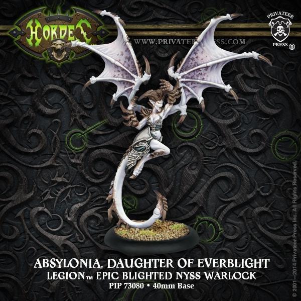 Absylonia était coutumière des transformations, mais grâce aux dons d’Everblight, son corps a désormais atteint une forme stable. Ses ailes géantes lui permettent de survoler le champ de bataille, transmettant sa rage meurtrière aux créatures qui la suivent. Son corps ne mute plus mais son sang est toujours en phase avec les énergies changeantes d’Everblight, et les rejetons qu’elle commande gagnent ses anciennes capacités de mutations.