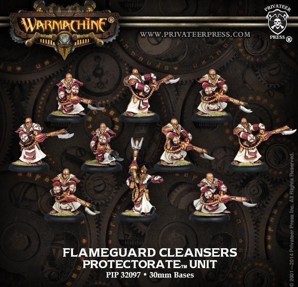 Les Cleansers du corps des Temple Flameguard sont chargés de la purge des hérétiques au sein du protectorat comme en dehors. Individuellement, chaque Cleanser est capable de nettoyer une zone au sein des ennemis de Menoth. Quand ils concentrent leur flammes purificatrices ; ils créent une conflagration au travers de laquelle seuls les plus fous ou les plus audacieux païens se risqueraient à passer.