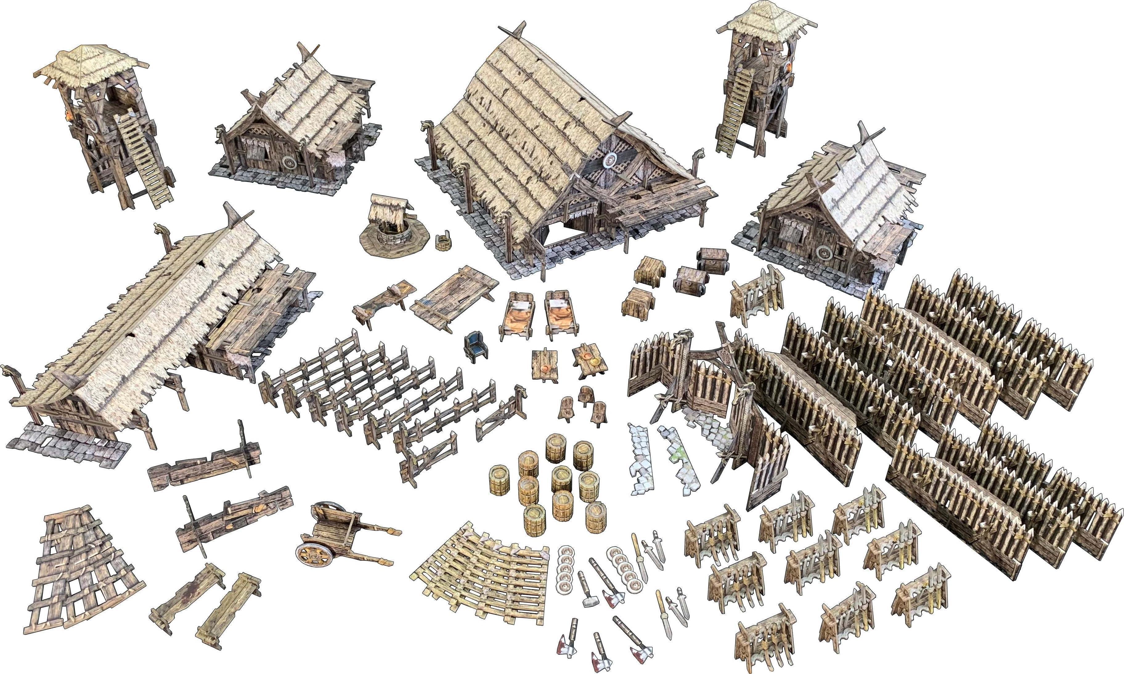 De simples troncs d’arbres aiguisés sont les défenses principales de nombreuses colonies et villes éloignées. Façonnés en maisons, écuries, halls et murs, ces matériaux primitifs ont un certain charme et peuvent être étonnamment résistants. Cette boîte contient tout le terrain dont vous avez besoin pour une table de jeu complète adaptée à de nombreux jeux fantastiques et historiques de 28-35 mm. Vous pouvez construire une colonie serrée sur une petite planche d’escarmouche ou répartir les pièces sur une plus grande table. La plupart des pièces sont modulaires et peuvent être assemblées dans n’importe quelle combinaison pour une configuration différente à chaque fois. Les toits sont amovibles et les bâtiments ont des intérieurs détaillés. Les décors sont fournis à plat sur un carton de haute qualité et haute densité, imprimée en couleur des deux côtés, donc aucune peinture requise ! Le terrain nécessite un assemblage et certaines pièces plus petites nécessiteront de la colle.