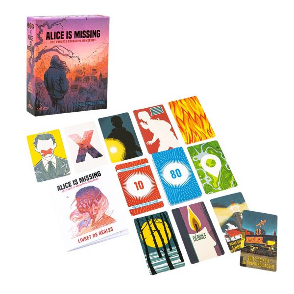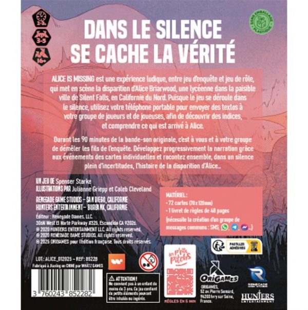 ALICE IS MISSING est une expérience ludique, entre jeu d’enquête et jeu de rôle. Alice Briarwood, une lycéenne de la paisible ville de Silent Falls en Californie du Nord, a disparu. Le jeu se déroule dans le silence. Utilisez votre téléphone portable pour envoyer des textos à votre groupe de joueurs et de joueuses, afin de découvrir des indices, et comprendre ce qui est arrivé à Alice. Durant les 90 minutes de la bande-son originale, c’est à vous et à votre groupe de démêler les fils de l’enquête. Développez progressivement la narration grâce aux événements des cartes individuelles et racontez ensemble, dans un silence plein d’incertitudes, l’histoire de la disparition d’Alice… Les + produits : – Une expérience inédite troublante – Une mécanique qui laisse toute la place à la narration – Une ambiance de série (enquête, ados,dramatique)