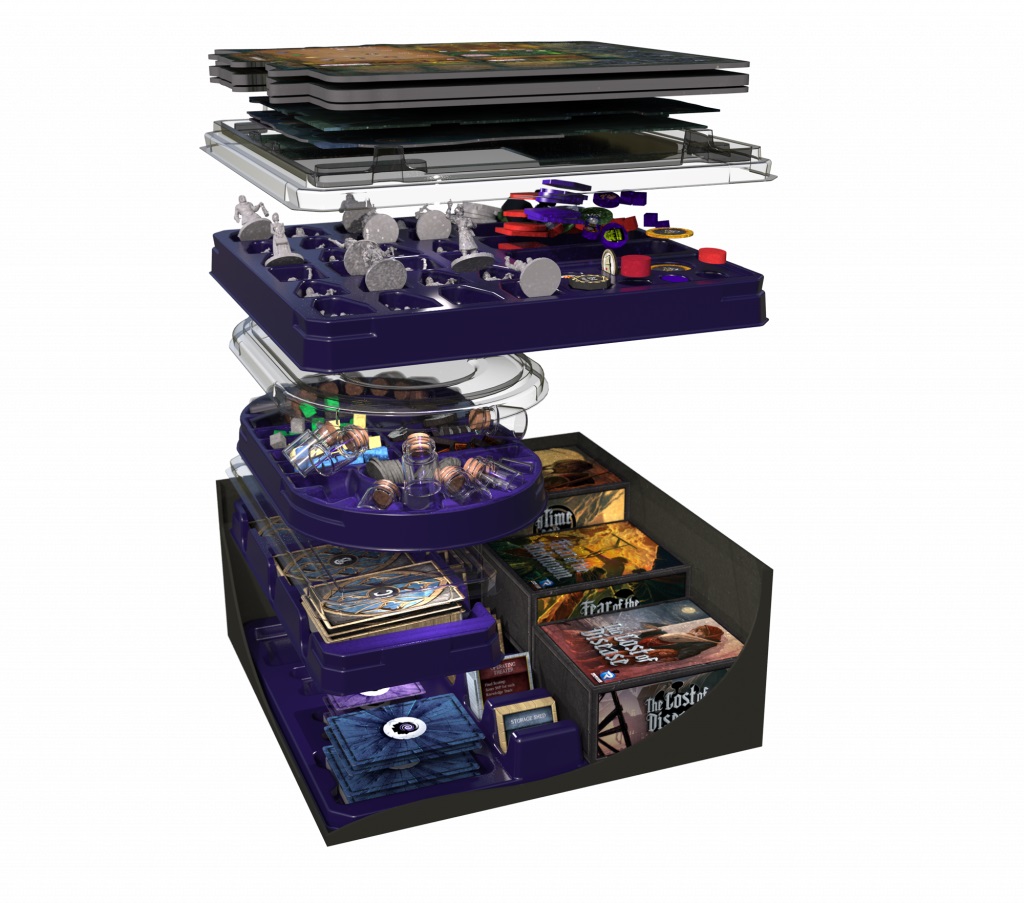 Vous jouez l’un des membres d’une fratrie à la fin du XIXème siècle, dont le père, tout juste décédé, s’avère être un savant fou qui vous a légué son laboratoire rempli d’inventions inachevées. Ambiance Frankenstein… L’objectif est de marquer le plus grand nombre de points de victoire en réalisant des expériences au fil de la partie, et en tentant de parachever le chef-d’œuvre de votre ancêtre sur plusieurs générations. Au cours du jeu, vous aurez jusqu’à 6 figurines, que vous posez tour à tour sur des Lieux du village ou de votre domaine. Chaque placement d’ouvriers déclenche une action. Mais attention, les figurines ont leur propre capacité et contraintes de pose. L’objectif est de récupérer dans ces Lieux les Ressources (Ingrédients, Connaissances, Argent) nécessaires pour compléter des cartes expériences qui elles-mêmes vous procurent d’autres Ressources, et ainsi de suite, pour se créer un moteur de production. Mais vous êtes face à une population qui a peur du progrès. Quand vous allez chercher des bouts de cadavres au cimetière ou des Connaissances en Occultisme au campement nomade, les jetons Foule en colère et Malepeur se rapprochent dangereusement l’un de l’autre sur une piste du plateau, et lorsqu’ils se rencontrent, vous subissez des malus à vos actions (coup de fourche dans les fesses, interdiction de venir au village, etc.). Heureusement vous pouvez vous racheter une bonne conduite en allant à l’église (ou au pub) et maîtriser la peur que vos expériences inspirent à la Foule, mais vous perdrez du temps. Et le temps est la ressource la plus importante du jeu. En effet, maîtriser le tempo du jeu, c’est maîtriser le jeu. Car le jeu se déroule sur 3 Générations, chacune découpée en 3 cycles de la vie (début-milieu-fin). Quand votre personnage meurt à la fin d’une génération, il ne lègue qu’une petite partie des ces recherches à son successeur, et toutes les Ressources non utilisées sont perdues ! Il faut donc optimiser la collecte des ressources et les dépenser au bon moment ! Comme dans la plupart des jeux de pose d’ouvriers, choisir un Lieu spécifique plutôt qu’un autre permet aussi de bloquer ou de ralentir l’adversaire (votre frère et/ou sœur en l’occurrence). Dans Le Secret de mon père, vous allez pouvoir développer également votre domaine, votre plateau individuel, où se loge notamment votre laboratoire secret. D’un côté en consignant vos expériences dans votre journal que vous transmettez intégralement de génération en génération. Ce journal apporte des bonus essentiels à votre progression dans le jeu (diminution du coût en ressources pour les prochaines expériences, avantages permanents, etc.). De plus vous pouvez aussi améliorer votre domaine pour obtenir plus d’argent, de ressources, de points de victoire, de figurines (et donc d’actions), etc. Le cœur du jeu réside dans les scénarios interactifs. Grâce à l’application gratuite, vous découvrez l’histoire qu’on vous raconte tout au long de la partie. En fonction des choix des joueurs, de leurs réussites ou échecs, l’histoire prendra des embranchements différents et modifie ainsi la mise en place, le matériel et les récompenses/malus. L’originalité vient également du plateau de jeu évolutif, en fonction de vos choix dans l’histoire, sous forme de cahier à spirales. Placez sur le plateau commun la page spécifique au cycle et à la génération en cours demandés par l’application. Le jeu contient 3 boîtes de scénario, avec son matériel exclusif, sa mise en place particulière (via l’application), ses objectifs propres, son histoire singulière.