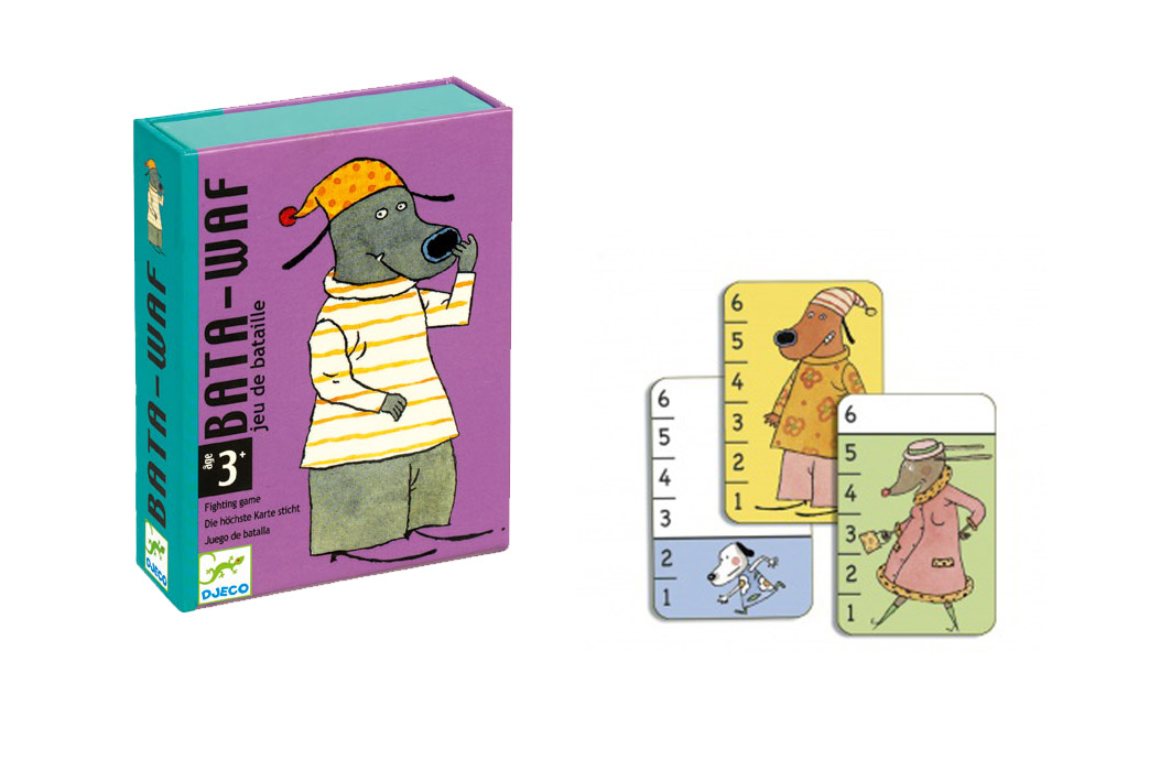 Jeu de bataille entre cartes "chiens" de différentes valeurs. Les illustrations sont originales comme la solide boite en forme de tiroir. On trouvera également une correspondance visuelle entre les chiffres de 1 à 6 et une hauteur de dessin.