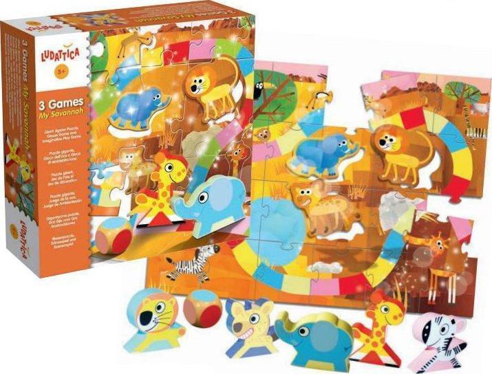 Un grand puzzle découpé de la savane, finement illustré. Le puzzle devient le décor d’un plateau de jeu magique avec les silhouettes des bébés animaux en bois. Il propose aussi un jeu de l’oie fondé sur les couleurs, sur un parcours ...