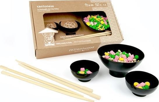 En utilisant les baguettes chacun doit récupérer un maximum d’ingrédients colorés et les mettre dans son propre bol. Celui qui en a le plus a gagné.