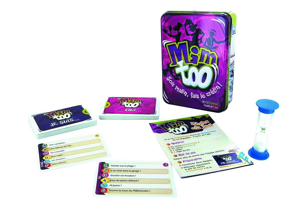 Deux équipes, deux pioches de cartes… et c’est parti ! Votre objectif : avoir cumulé plus de points que l’équipe adverse lorsque les deux talons seront épuisés. À chaque tour, vous devrez mimer à vos partenaires des scènes très insolites, après avoir tiré une carte dans deux pioches différentes. La première carte vous indiquera le sujet (par exemple « un cheval ») et la seconde, l’action que ce dernier est en train d’effectuer (« fume un cigare » par exemple). Si vous parvenez à tout faire deviner à votre équipe avant la fin du sablier, vous marquerez les points indiqués sur les cartes !
