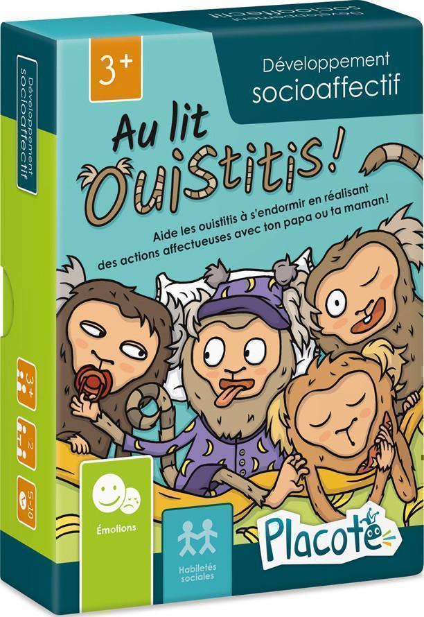 Objectif : Favoriser la relation parent-enfant C’est l’heure du dodo pour les quatre petits ouistitis ! Avec papa ou maman, aide-les à s’endormir en posant des gestes calmes et affectueux comme flatter les cheveux ou chanter une chanson douce. Mais attention de ne pas les réveiller, car il faudra tout recommencer ! Au lit ouistitis ! est conçu pour favoriser une relation parent-enfant positive à travers des expériences amusantes et tout en douceur. Il permet aux enfants de 3 à 7 ans de passer un moment privilégié avec l’un de leurs parents en réalisant différents gestes d’attention et d’affection qui peuvent être intégrés au quotidien et à la routine du dodo. Passer du temps de qualité avec son enfant et lui démontrer de l’affection est essentiel à son développement. Au lit ouistitis ! permet de renforcer la relation parent-enfant à travers des expériences amusantes et tout en douceur. Plus précisément, le jeu permet de réaliser différents gestes calmes et affectueux qui peuvent être intégrés au quotidien et à la routine du dodo, comme chanter une chanson douce, flatter les cheveux et masser les mains et le dos. En jouant à endormir des ouistitis à l’aide d’actions apaisantes, l’enfant passe un moment agréable et privilégié avec un de ses parents.