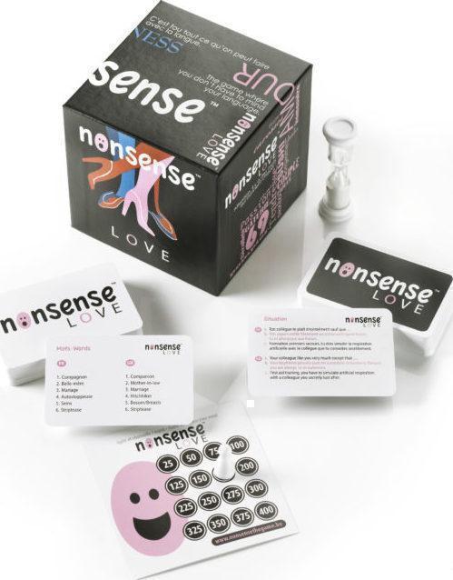 Le principe de Nonsense est de raconter au départ d’une situation donnée une histoire de votre cru et de glisser un mot secret (toujours des noms communs) au nez et à la barbe du public. Comment joue t-on ? Tout d’abord, vous choisissez un mot secret. Un autre joueur vous donne ensuite une situation. Vous avez alors une minute pour raconter la suite de l’histoire tout en plaçant subtilement votre mot secret et en brouillant les pistes pour que les autres joueurs ne le devinent pas. La règle DUO permet de dialoguer avec un autre joueur de son choix sur la base de situations appropriées.