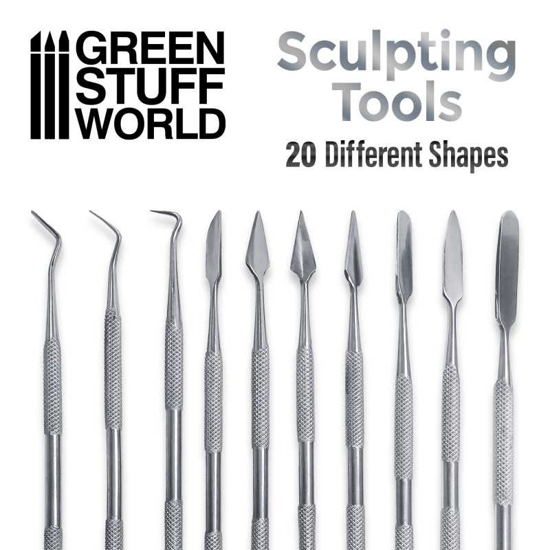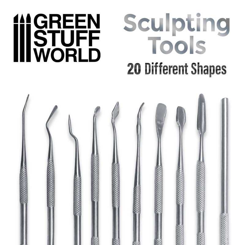Set pro d’outils de modelage, composé de 10 doubles outils de modelage pour la sculpture et la modélisation. Avec un total de 20 extrémitées différentes en acier inoxydable t pour être utilisé avec des mastics de tout genre comme Green Stuff, Milliput, Sculpey, argile, etc ... pour tous les types de modélisation et de raffinement de figurines artistiques. Matériau : acier inoxydable Production : artisanale Polissage : à la main Matériau de la pochette : vinyle noir Quantité : 10 outils