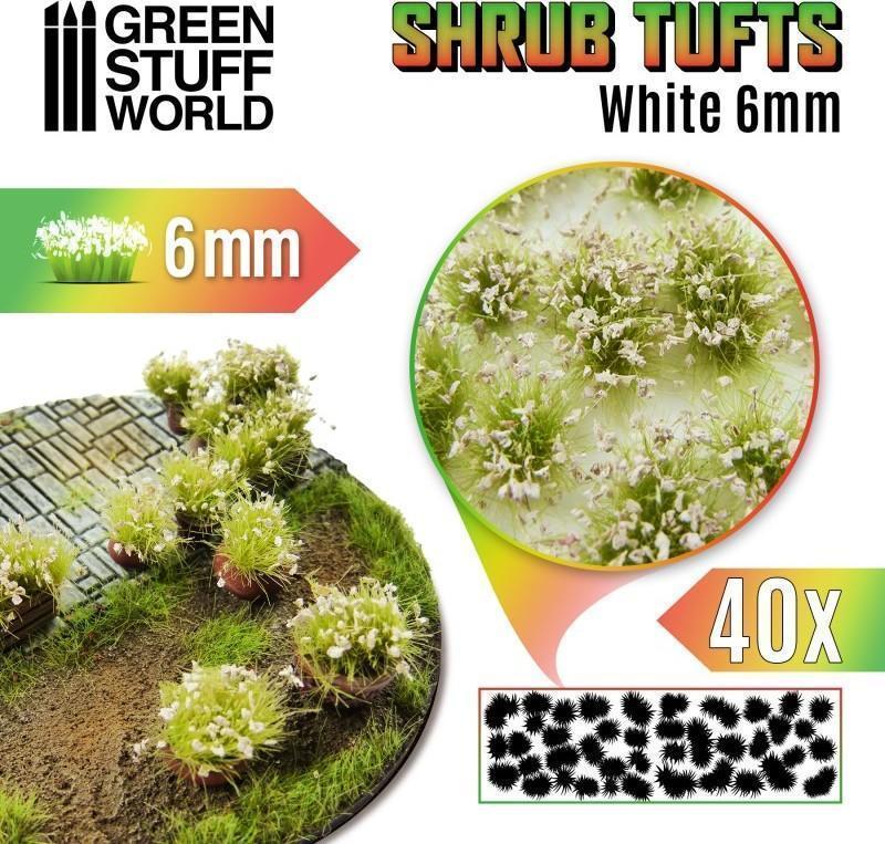 Touffes d’arbustes / buissons - 6mm - Auto-Adhésif - BLANC Ces touffes très réalistes sont parfaites pour les socles de figurines, les dioramas et les décors. Elles ont été conçues pour tenir à la verticale, ce qui ajoute une dimension supplémentaire aux socles de vos figurines. Une fois que vous avez fini de peindre vos figurines, simplement détachez une ou plusieurs touffes de la plaque avec des pincettes, et collez les directement sur votre décor. Ne oubliez que, même si elles sont auto-adhésif, un peu Colle PVA peut être nécessaire dans certains surfaces inégales pour une solution permanente. Type d’herbe : mélanges de fibres de Nylon Flock +feuilles Dimensions de la Feuille:4x15cm Hauteur : environ 6mm Nombres de pièces : 40 Touffes