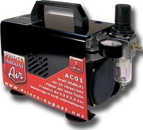 Le compresseur AC01 à piston sec sans huile et à démarrage/arrêt automatique équipé d’un manomètre qui vous permettra de contrôler la pression d’air, d’un filtre à air et d’un purgeur, qui faciliteront l’évacuation de l’humidité. Prince-August garantit tous ses aérographes et compresseurs 3 ans à compter de leur date d’achat. Cette garantie s’entend, contre tous les défauts de matériel ou de fabrication, sous réserve d’une utilisation conforme. En sont exclues les pièces d’usure telles que les joints d’étanchéité, les buses, les aiguilles etc…