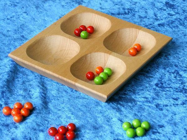 Un joli plateau en bois à 4 alvéoles, 24 petites boules en bois, il n’en faut pas plus pour