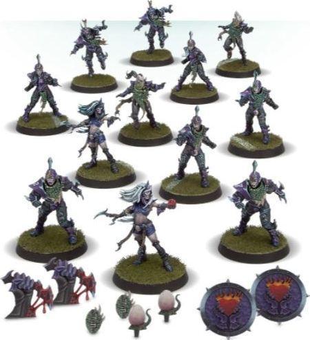 Ce kit plastique contient les composants nécessaires pour assembler les Naggaroth Nightmares, une équipe d’Elfes Noirs pour Blood Bowl. L’équipe se compose de 6 Linemen, 2 Blitzers, 2 Runners et 2 Witch Elves. Tous portent des pièces d’armure cloutées, et des peaux de Cold Ones drapées sur les épaules. Les Witch Elves sont… sensiblement moins couvertes, et on peut les assembler soit tendant les mains vers l’adversaire d’un geste impérieux, soit serrant un cœur encore palpitant. Les Linemen comportent trois modèles de têtes différents.