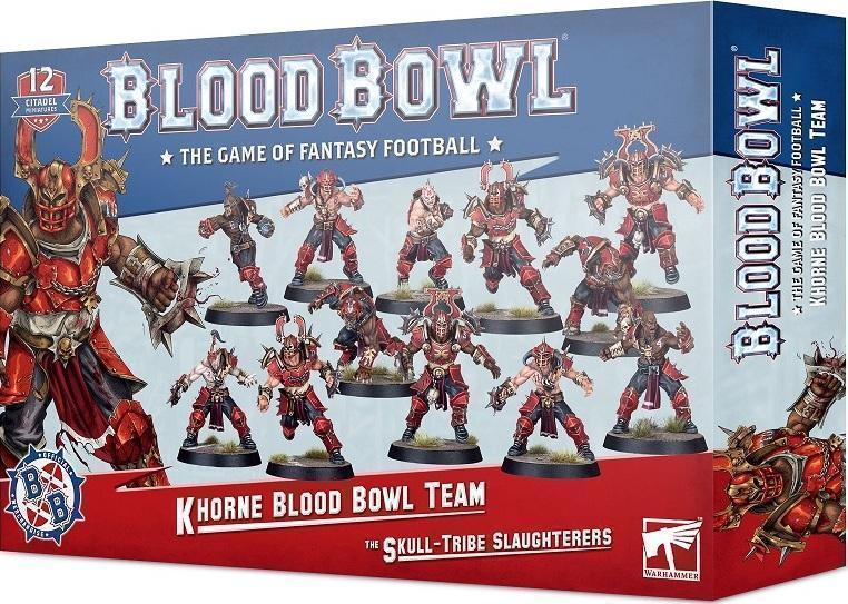 Les équipes de Blood Bowl de Khorne sont souvent désavantagées dans les ligues en raison de leur incapacité à marquer des touchdowns avant de saigner leurs adversaires. Contre toute attente, les Skull-tribe Slaughterers échappent à cette tendance, car ils croient que plus ils s’éléveront dans les ligues, plus gros seront les crânes qu’ils pourront récolter pour Khorne. En conséquence, les Skull-tribe Slaughterers ont apposé leur marque extrêmement sanglante sur la NAF en tant qu’une des meilleures équipes du circuit. Vous voulez une équipe capable de mutiler facilement vos adversaires, et de marquer de beaux touchdowns ? Les équipes de Khorne ont tout ce qu’il faut côté bagarre et juste assez de cervelle pour exploiter leur brutalité. Les Marauder Linemen sont suffisamment solides pour encaisser les dégâts, et assez malins pour se rappeler de passer le ballon pendant les matchs. Ceux qui survivent au terrible régime d’entraînement des équipes de Khorne deviennent des Bloodseekers. Incroyablement violents et sanguinaires jusqu’à l’obsession, ils se spécialisent dans la mise à la retraite d’office des joueurs adverses tout en se déchargeant des ballons sur leurs coéquipiers Khorngors – des Beastmen canins qui ne pensent qu’à marquer des touchdowns. Le kit se compose de 64 pièces plastique avec lesquelles vous pouvez assembler les Skull-tribe Slaughterers, une équipe de Khorne à utiliser dans vos matchs de Blood Bowl. L’équipe est composée de 6 Bloodborn Marauder Linemen, 4 Bloodseekers, et 2 Khorngors. Cette boîte contient 2 pièces Blood Bowl double face, 2 pions de tour et de relance, 4 ballons de Blood Bowl, et une feuille de décalcos de 222 symboles et icônes pour personnaliser votre équipe. Ce kit est également fourni avec 12x socles ronds à fente Citadel de 32mm. Les règles pour utiliser les équipes de Khorne dans vos parties de Blood Bowl se trouvent dans le Spike ! Journal n°13. Ces figurines sont fournies non peintes et nécessitent assemblage – nous recommandons d’employer la Colle Plastique Citadel et la peinture Citadel.