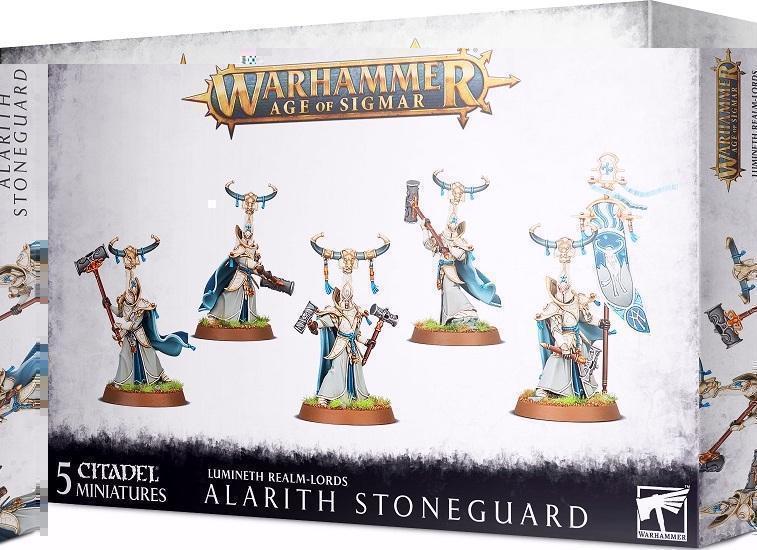 Les temples alariths acceptent la montagne comme leur maître et, ce faisant, héritent d’une partie de sa force et de sa robustesse. Ils combattent tels des objets immuables, maniant des marteaux magiques pouvant fracasser un crâne d’un seul coup mesuré. L’Alarith Stoneguard est une infanterie d’élite capable de s’aventurer dans la mêlée la plus dense et d’en sortir victorieuse. Que ce soit en chassant les ennemis des objectifs ou en défonçant les unités adverses les plus solides, vous verrez que la Stoneguard est aussi bien une enclume qu’un marteau. Ce kit permet d’assembler 5 Alarith Stoneguards, les options pour monter un porte-étendard et un Truestone Seneschal. Chaque Alarith Stoneguard peut être armé au choix d’un maillet de pierre ou d’un pic de diamant, tandis que le Truestone Seneschal peut manier une paire de marteaux à strates. Le tout est fourni en 63 composants plastique, plus 5 socles ronds de 32mm.