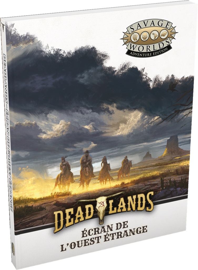 L’écran de l’ouest étrange est un écran de meneur de jeu personnalisé pour Deadlands, l’Ouest étrange et rassemble les tables usuelles à cet univers et quelques incontournables tables génériques de Savage Worlds Adventure Edition (SWADE). En plus de l’écran 3 volets (panoramique), vous y trouverez également une aventure originale de 32 pages intitulée Duel à Sundown.