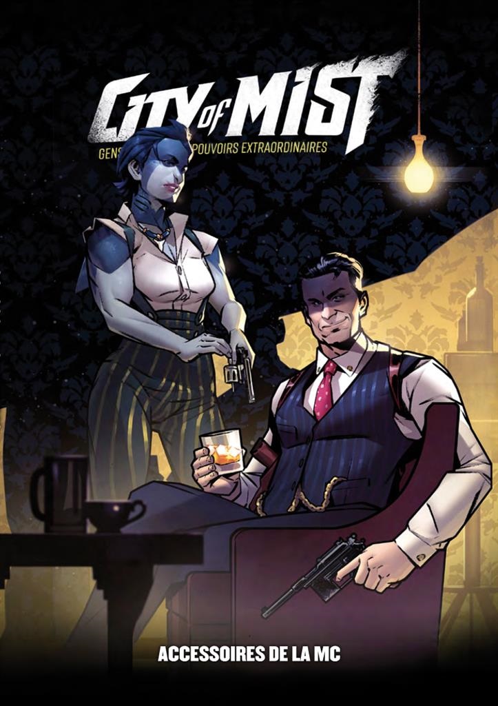 Les Accessoires de la MC constituent le complément indispensable. Il contient un magnifique écran en 3 volets ; un livret de 80 pages présentant un cadre de campagne pour vous lancer dans City of Mist, des personnages prêts-à-jouer et deux affaires complètes et détaillées : Les Dents de Miller’s Square et Amnesia Town ; un jeu de feuilles cartonnées présentant un résumé des règles pour les joueurs, pour la MC ainsi que des cartes de suivi plastifiées à découper.