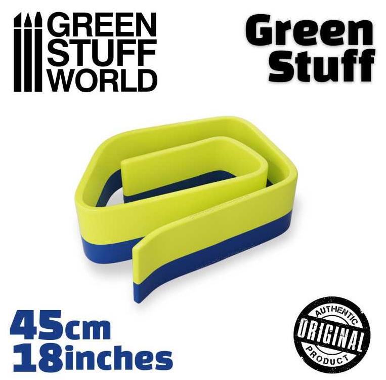 a Résine Verte ou Green Stuff est un pâte époxy plastique qui durcit à température ambiante et peut être achetée à la fois en rouleaux et en barre. En mélangeant 50/50% o 60/40% des deux composants, on obtient un mastic vert extrêmement collant, on obtient un mastic vert extrêmement collant. Une fois mélangés, on aura environ 90 minutes pour mouler et faire des détails, et en 24 heures on obtiendra la dureté maximale. En modifiant les proportions de la composante jaune / bleu, on obtiendra un durcissement plus rapide / lent et une dureté plus ou moins grande. Nous recommandons d’utiliser du lubrifiant afin d’éviter que le mastic se colle et pour obtenir des formes plus lisses. Normalement, avec de l’eau, c’est suffisant mais certains sculpteurs utilisent aussi un peu d’huile, de la vaseline ou de l’huile Johnson. Il faudra maintenir toujours les outils humides. On peut également ajouter du talc pour modifier sa texture légèrement et réduire les traces de doigts. Nous vous recommandons de conserver la pâte dans un endroit froid ou même à l’intérieur d’un réfrigérateur pour une meilleure conservation. Ce kit contient 18 pouces de matériel -> 45 cm