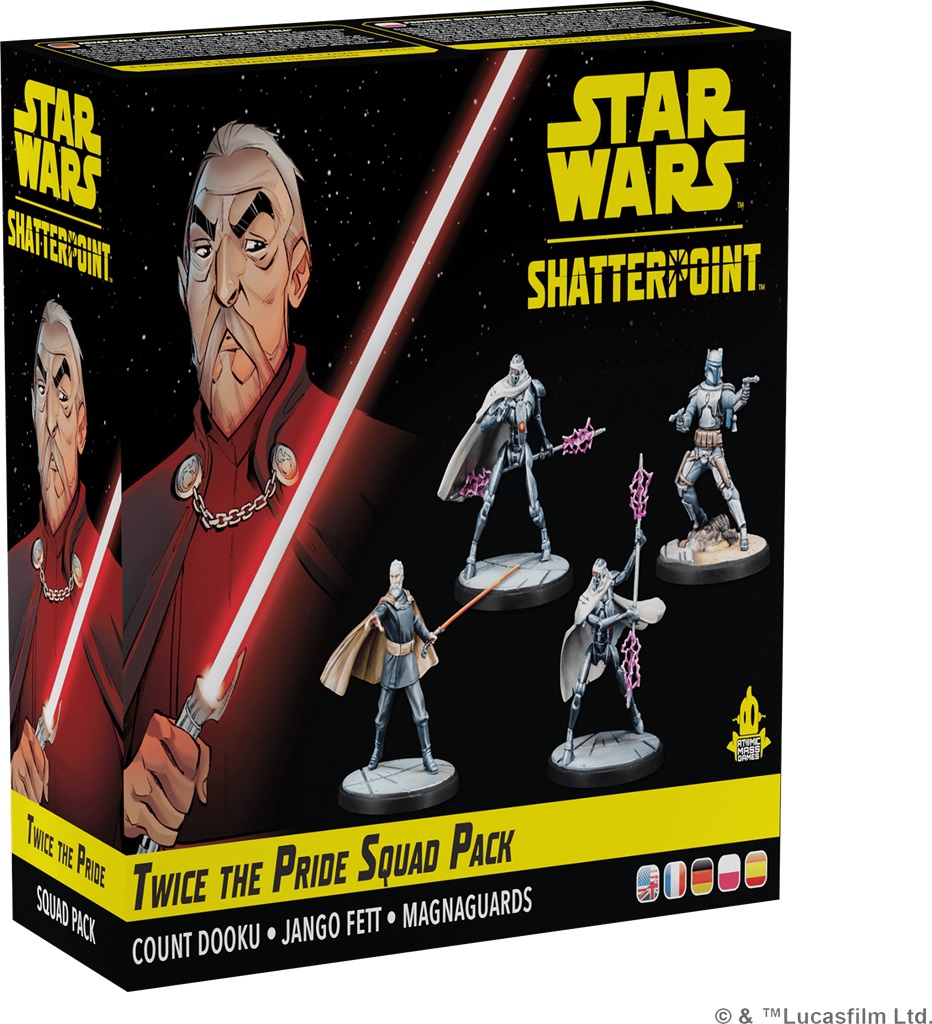 Un sinistre seigneur Sith et ses serviteurs entrent dans les duels de Star Wars : Shatterpoint ! Autrefois Chevalier Jedi respecté et padawan du Grand Maître Yoda lui-même, le comte Dooku a choisi le côté obscur, devenant l’apprenti de Dark Sidious lui-même. Ce set ajoute à Star Wars : Shatterpoint une nouvelle escouade composée du Comte Dooku, de Jango Fett et de 2 Magna Gardes IG-100 que les joueurs peuvent jouer immédiatement ou utiliser avec d’autres personnages pour créer leur propre escouade. En plus de figurines magnifiquement sculptées des quatre personnages, les joueurs trouveront également toutes les cartes dont ils ont besoin pour donner vie à ces personnages sur le plateau de jeu.
