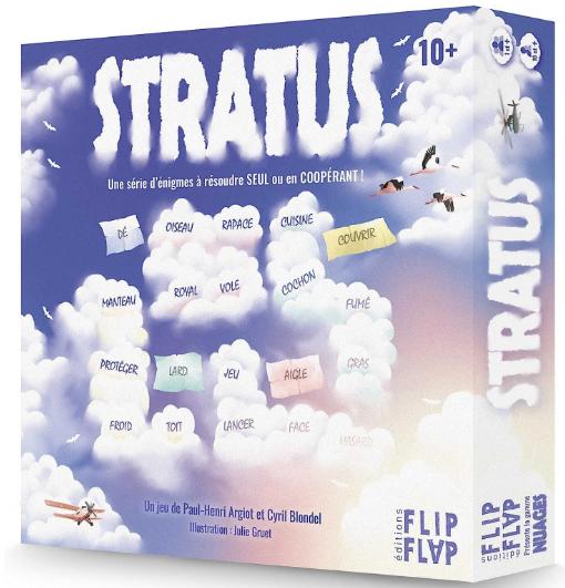 Stratus est un jeu d’énigmes à résoudre en posant des nuages sur quatre mots regroupés grâce à un mot-clé, à trouver aussi parmi les mots ! À la fin, pour valider la résolution, les mots-clés forment un rébus humoristique. Jeu de déduction, utilisant les associations d’idées et l’agencement spatiale. Il faut regrouper des mots qui ont en commun un même mot-clé. A la fin, l’ensemble des mots clés forme un rébus qui permet de jouer avec la phonétique. Stratus invite aux jeux de langage et d’associations d’idées. Grâce à leur déduction, les joueurs doivent trouver des liens entre quatre mots et un mot-clé présent dans la grille. Ils doivent s’appuyer sur les synonymes, les contraires, les catégories, les expressions... En s’aidant des formes géométriques des nuages, ils doivent essayer de recouvrir tous les mots. A la fin, les 7 mots clés doivent être lus en ligne pour former une phrase "phonétique", un rébus souvent humoristique. Cette mécanique est rassurante car elle permet d’observer sa progression pas à pas, validée par les formes géométriques, et la phrase finale découverte est une belle récompense.
