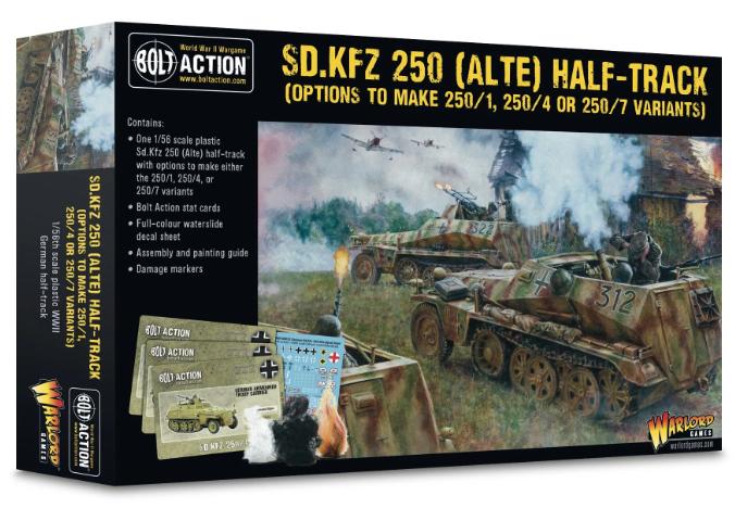 Includes one plastic Sd.Kfz 250 (Alte) half-track, Bolt Action stat cards, full-colour waterslide decal sheet, assembly & painting leaflet, and vehicle damage markers.
