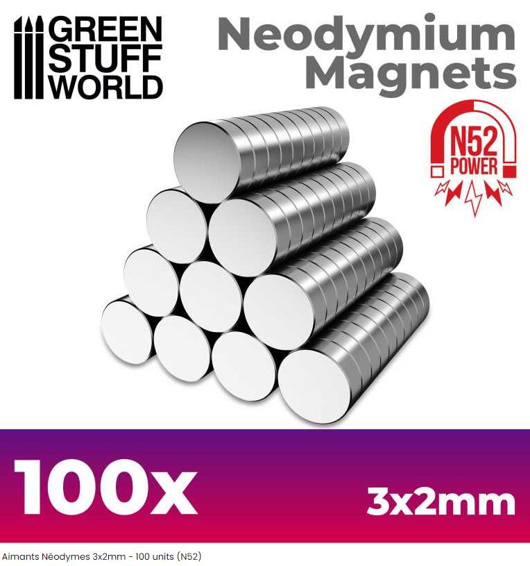 Aimants Néodymes Diamètre : 3mm Epaisseur : 2mm Quantité : 100 Magnétisation : N52 Force d’attraction : 252gr (aimant + aimant) ** Matériau : NdFeB Revêtement : Nickel (Ni-Cu-Ni) Les aimants néodyme NdFeB sont les plus puissants aimants permanents - constants qui soient disponibles à l’heure actuelle. La matière qui les compose est produite par frittage. Les différentes formes sont découpées en fonction des dimensions souhaitées par les clients. Les désignations N35 et N52 sont une mesure de la qualité du matériau utilisé. Le plus grand le grade est (le nombre après le "N"), l’aimant sera plus puissant. Elle nous fournit deux données : 1. Combien "d’énergie magnétique" est stockée par unité de volume dans l’aimant. 2. À quelle température maximale peut-on utiliser l’aimant. Nos aimants commencent par un N et leur température d’utilisation maximale est de 80°C (176°F). Les aimants avec une plus grande force d’attraction actuellement disponibles sont le N52. En ce qui concerne la force, pour deux aimants de taille et de magnétisation différentes, le volume sera le plus souvent plus déterminant que la force magnétique. Pour cette raison, le plus gros aimant est en général le plus fort, même si sa valeur de magnétisation est plus faible. ** Force d’attraction : Ils sont estimés des forces d’attraction sur la base des tests de nos propres aimants. Cette information est valable uniquement pour les points situés le long de l’axe central de l’aimant, et un seul aimant en supposant aucune autre force. Si l’utilisation est pour figurines nous recommandons : - 3x0.5mm pour les petits morceaux - 3x1mm pour échanger les armes, des têtes, des bras, ... - 3x2mm pour les bases de figurines en plastique - 5x2mm pour les bases de figurines en métal