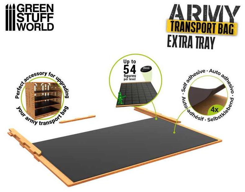 EXTRA TRAY - Mallette de transport Extra Tray est un plateau métallique conçu pour ajouter un niveau supplémentaire d’étagères au système de stockage GSW Army Transport Bag y GSW Cabinet. Fabriqué en bois MDF, il peut contenir jusqu’à 54 figurines de taille moyenne. Dimensions : 29x17,5cm. Poids total 350g. Comprend : - 1x plateau - 1x feuille métallisée autocollante et des pièces de guidage pour créer un nouveau niveau d’étagères - 1x pièces guides