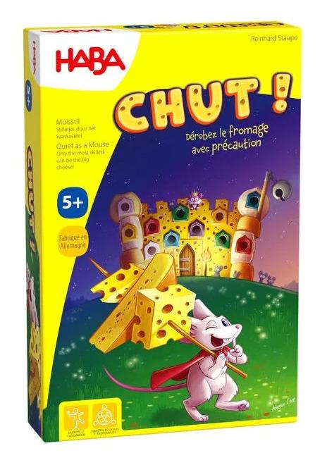 Découvrez le jeu Chut ! de Haba, un jeu d’adresse et de concentration pour les enfants à partir de 5 ans. Sans faire de bruit, les enfants insèrent délicatement leurs baguettes à travers les trous du château-fromage sans faire retentir les clochettes d’alarme. Celui qui a le moins de baguettes à la fin remporte la partie. Une règle simple et facile à comprendre qui favorise la dextérité et la concentration des enfants.