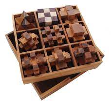 Magnifique coffret en bois avec 9 casse-têtes en bois de différentes difficultés.