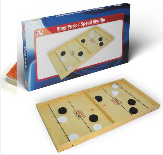 Jeu de palets pour 2 joueurs "Passe trappe". Un jeu en bois traditionnel de très belle qualité où vous devrez faire passer les palets sous un petit tunnel pour que les palets restent dans le camp adverse. Un jeu de dextérité et d’adresse très actif. Les élastiques propulsent les palets sur le plateau, à vous d’être adroit et de bien viser pour vous débarrasser de tous les palets. Jeu aussi appelé pousse-palets, passe-trappe, sling puck, speed shuffle... Plateau de jeux en bois de 54 x 27 cm avec 2 grandes zones avec des élastiques pour le lancer et 10 palets en bois (5 noirs et 5 blancs). Parfait comme jeu en autonomie pour vos fêtes de famille, en centre de loisirs ou ludothèque.
