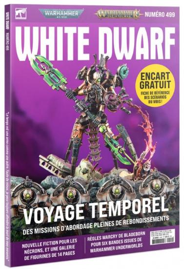 White Dwarf est le magazine Warhammer officiel, rempli de contenu mensuel incroyable, dont de nouvelles règles et de l’historique inédit, des nouvelles, des articles réguliers, des invités spéciaux, et bien plus. Voici ce qui vous attend dans le numéro d’avril : Contact ! – Lettres, questions et photos de figurines de votre part, chers lecteurs. Au Cœur du Studio – Ce que nous avons peint dernièrement. Avec en prime un aperçu de ce qui se profile… LE BUNKER WHITE DWARF Accès Autorisé ! – Présentation des activités qui ont eu lieu ce mois-ci au Bunker White Dwarf. Défis – Êtes-vous paré à relever notre défi Psykers, Sorciers et Surnaturel ? La Campagne de Croisade – De nouvelles reliques de Croisade et la suite de notre campagne. Comment se passe la vôtre ? Scénario du Mois – Des scénarios inédits pour 40K et AoS, plus un Générateur de Plans de Bataille pour Warcry. Formation de Base – Qui a la priorité dans ce cas ? Le guide tactique de ce numéro devrait clarifier les choses. Le Coin Hobby – Deuxième partie de la création d’un schéma de couleurs : de l’idée à l’unité peinte. Liaison Satellite – Les Redditch Tabletop Gamers se signalent, et nous montrons des figurines magiques. WARHAMMER 40,000 Le Choix des Armes – C’est le défi final pour James, Rhu, Joe et Andy, et ils ne reculeront devant rien. Les Mystères des Crypteks – Chrono-psycho-techno-pyromancie. Que ne savent donc pas faire les Crypteks ? Manger… Tempus Purgatus – La première partie d’une nouvelle située dans le passé-présent-futur d’une Technoprêtresse. Anomalies Temporelles – Prenez du bon temps avec ces missions d’Action d’Abordage à décalage temporel. Osts Galactiques : Nécrons – De l’inspiration de modélisme et de peinture dédiée aux véritables dirigeants de la galaxie. Galerie d’Armée : Exterminez les Xénos – Martin Waller, gagnant du Golden Demon, nous présente sont armée de la Deathwatch. WARHAMMER AGE OF SIGMAR L’Arche des Arcanes : La Foi et les Prêtres des Cultes Unberogen – Votre foi envers le Dieu-Roi de Sigmar est sans faille ? Joignez-vous aux Cultes Unberogen. Éophores : Les Râles des Canalisations – Quelque chose de sinistre hante les égouts de Hammerhal dans ce bref récit… Règles d’Engagement – Tu Cherches la Bagar’ ? Jimbo nous révèle ses dix règles narratives préférées. Bladeborn de la Mortegorge – Six bandes de Bladeborn migrent de Warhammer Underworlds à Warcry. AUTRES JEUX NECROMUNDA La Succession Aranthienne : Des Rues Mortelles – Voici la fin de la campagne du studio. Mais qui a triomphé dans le Sous-monde ? ARTICLES SPÉCIAUX Les Mondes de Warhammer – Des vieilles rancunes à une mutinerie récente, la guerre civile entache les mains des civils. L’Héritage de l’Audace : IV< – C’est également la fin de notre série sur les Tome Keepers. Quel sera le sort d’Istrouma ? Chaque exemplaire du numéro 499 contient également un encart en carton comprenant le scénario du mois pour Warhammer 40,000 et pour Warhammer Age of Sigmar.