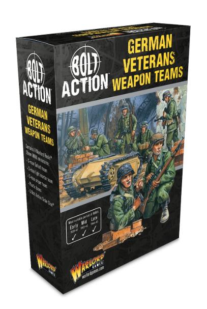 Box contains seven Warlord Resin German Veteran Infantry figures, three Bolt Action Order dice, and plastic bases.