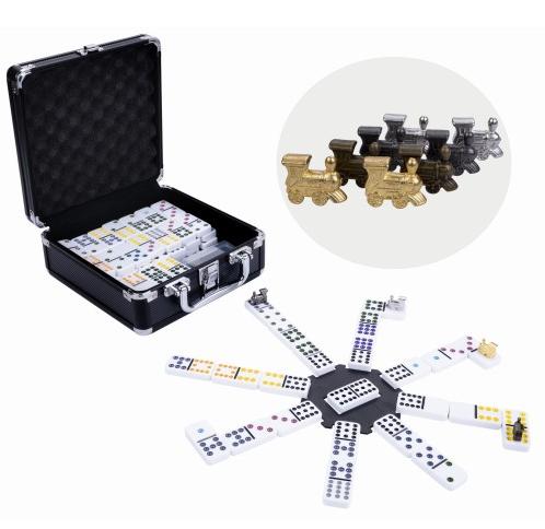 Train Mexicain Dominos Black Metal. Jeu complet avec 91 dominos jusqu’au double 12, 9 locomotives en métal et la gare en plastique, dans une valise en aluminium noir.
