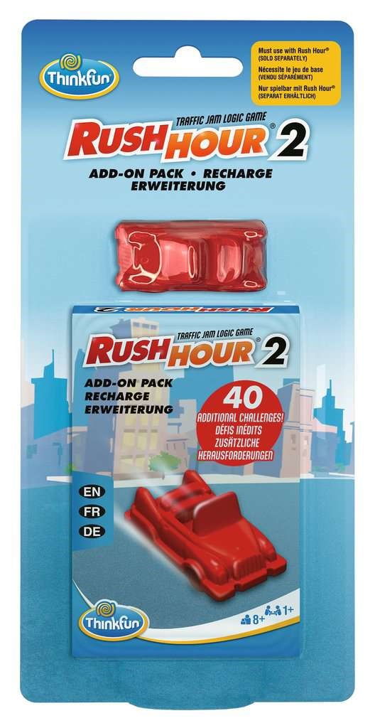 Rush Hour® est le champion des jeux de blocs à déplacer ! Cette recharge Rush Hour® contient 40 cartes de défis inédits et un nouveau véhicule d’évasion (un Cabriolet) pour votre jeu Rush Hour® original. Encore plus de défis amusants et stimulants pour tous les âges ! Nécessite le jeu de base. Dès 8 ans.