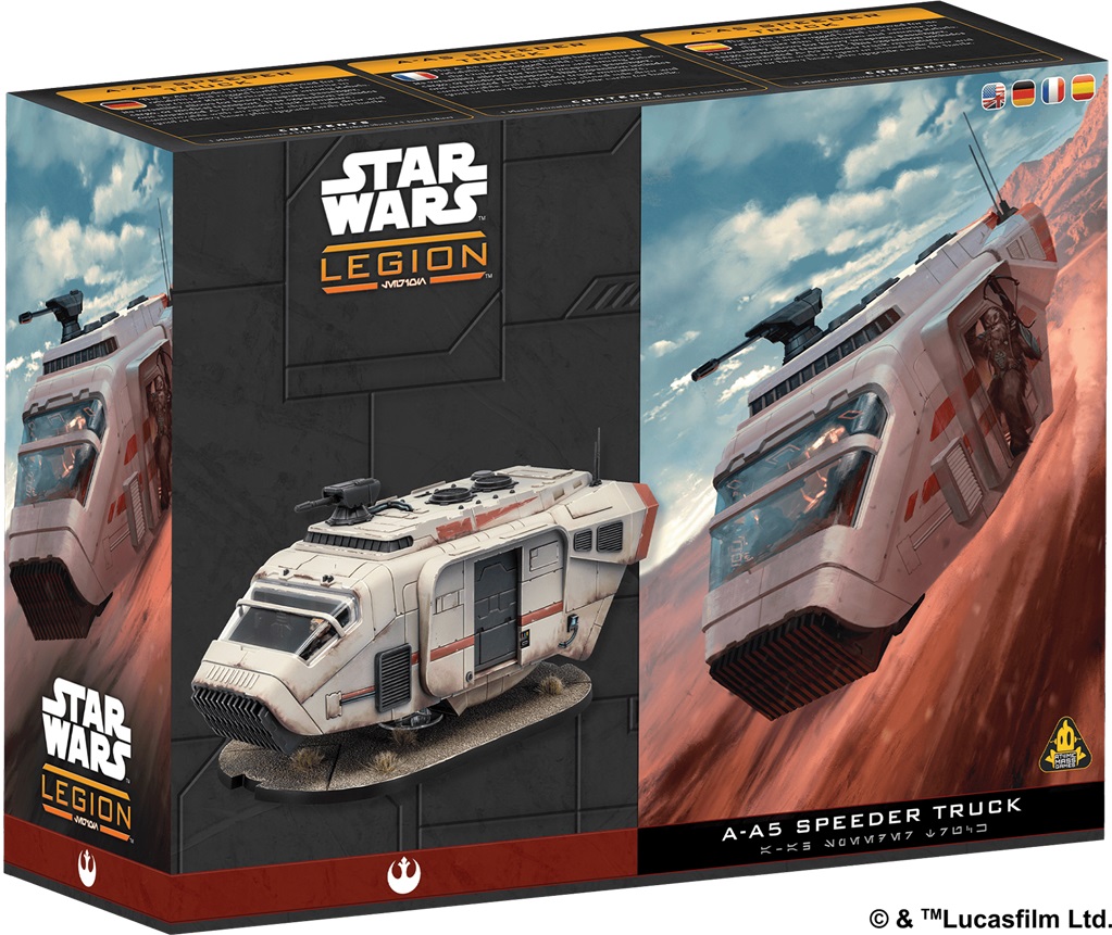 Robuste et fiable, le camion speeder A-A5 est très présent dans la Bordure Extérieure et fortement apprécié des Rebelles. Ce véhicule polyvalent peut être équipé d’armes lourdes, embarquer du personnel, de la marchandise ou du matériel médical. Cette extension contient une figurine de camion speeder A-A5 à peindre, que vous pourrez assembler avec la porte ouverte ou fermée et équiper d’un canon laser lourd ou d’un quadrilaser, ainsi que de nombreuses cartes Amélioration. Il est livré avec deux emplacements d’équipage et un emplacement de pilote : il devient un centre de commandement mobile avec Shriv Surgaav au volant. Figurine à monter et non peintes.