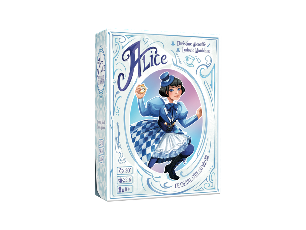 Alice est un jeu à cocher compétitif où chaque joueur doit reproduire sur sa fiche les formes révélées au centre de la table. À chaque tour, une carte Forme est retournée : tous les joueurs tracent la forme sur leur fiche en respectant des règles de placement simples mais tactiques. Certaines cases déclenchent des bonus : agrandir ou réduire une forme, marquer des points ou activer des effets. Le twist : la fiche est recto-verso, et on la retourne en cours de partie en traversant un miroir ! Un système de zones colorées et d’icônes à optimiser enrichit les choix. Un mode équipe complète l’expérience pour des parties en duo avec des objectifs asymétriques. Le scoring croisé et les multiples interactions entre les éléments rendent chaque partie vivante, fluide et maline.