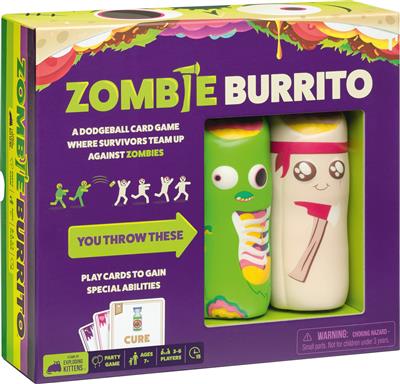 Plus c’est le chaos, plus c’est rigolo ! Cela pourrait être la devise de Zombie Burrito. Ce jeu d’ambiance fait s’affronter une équipe de Zombies et une équipe de Survivants (tirage au sort). Commencez par faire de la place autour de vous et rangez tous les objets fragiles, ça va déménager ! Chaque joueur reçoit une pioche de 15 cartes, prend les 5 premières cartes puis, au signal, tout le monde joue en même temps et s’échange les cartes le plus vite possible. L’objectif : réunir des triplettes, 3 cartes identiques qui vous donneront des avantages durant les combats, ou provoqueront un duel ! Utilisez alors vos burritos en mousse, vous en avez un par équipe : le but est de toucher tous les adversaires de l’équipe adverse pour gagner le combat. Comme dans une balle au prisonnier, les esquives sont autorisées et vous pouvez attraper le burrito au vol pour éliminer le lanceur. Si vous remportez 3 duels, vous gagnez la partie.